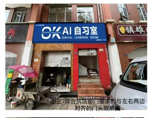 李女士认为,如果按照综合执法队工作人员的要求左右对齐(如图三所示),会挤占到楼梯左侧小吃店的门头位置,可能会损害到旁边小吃店的利益,引发不必要的邻里矛盾。而原来的门头设计(如图二所示),既给小吃店预留了门头位置,也结合实际情况做了整体设计,看上去更加协调合理。李女士觉得作为一家自习室,要为积极响应国家号召,构建学习型社会尽一份力量,有义务做一个比例协调,大小合适的门头来维护自习室对待教育的形象!